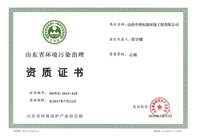 我司获得由山东省环境保护产业协会颁发的《环境污染治理资质证书》。